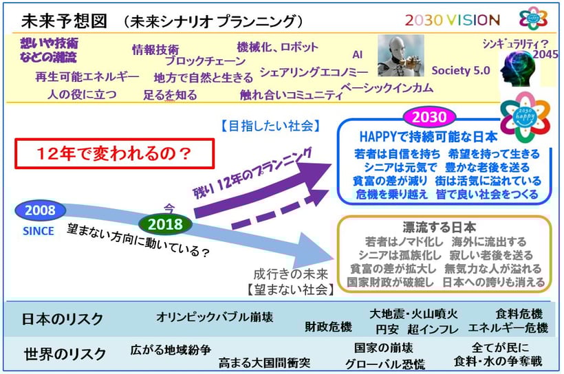 そこで、当時は22年先だった 2030年をターゲットとして、この国のありたい姿を皆で考えて共有し、その実現に向けてともに行動していこうということで、活動を始めました。