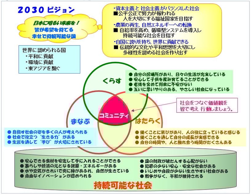 私たちは、「公平公正で努力が報われ 人を大切にする福祉国家」「自給率を高め、循環型で持続可能な社会」「伝統的な文化や平和思想を大切にし多様性を認める社会」を目指す姿としていました。